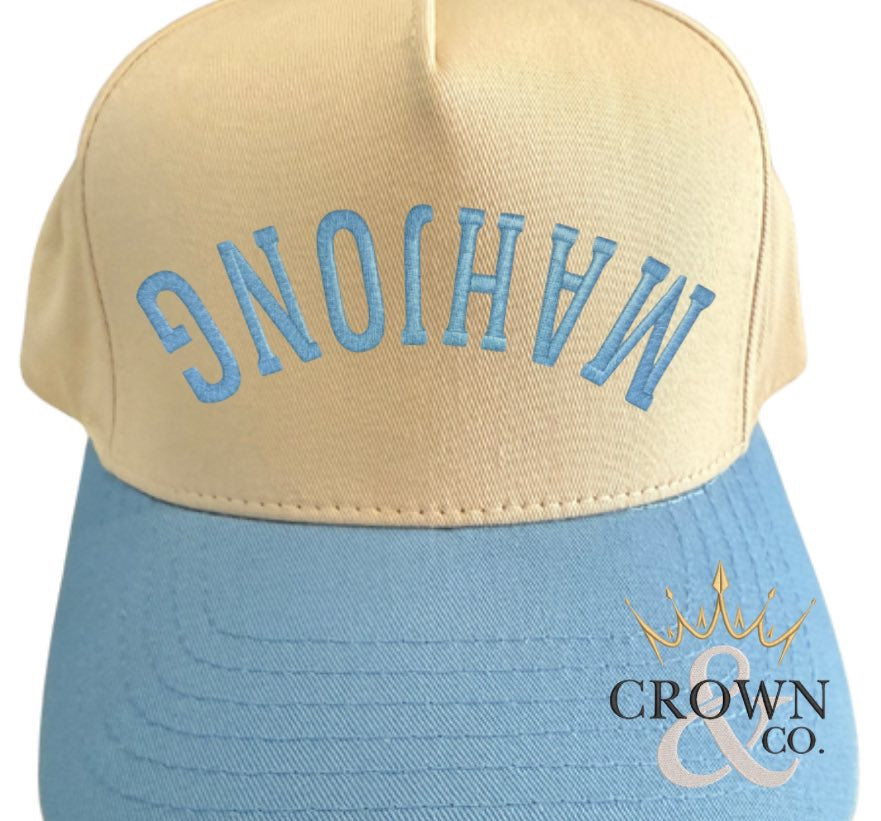 Blue two tone embroidered hat with Mahjong tiles hat $52.